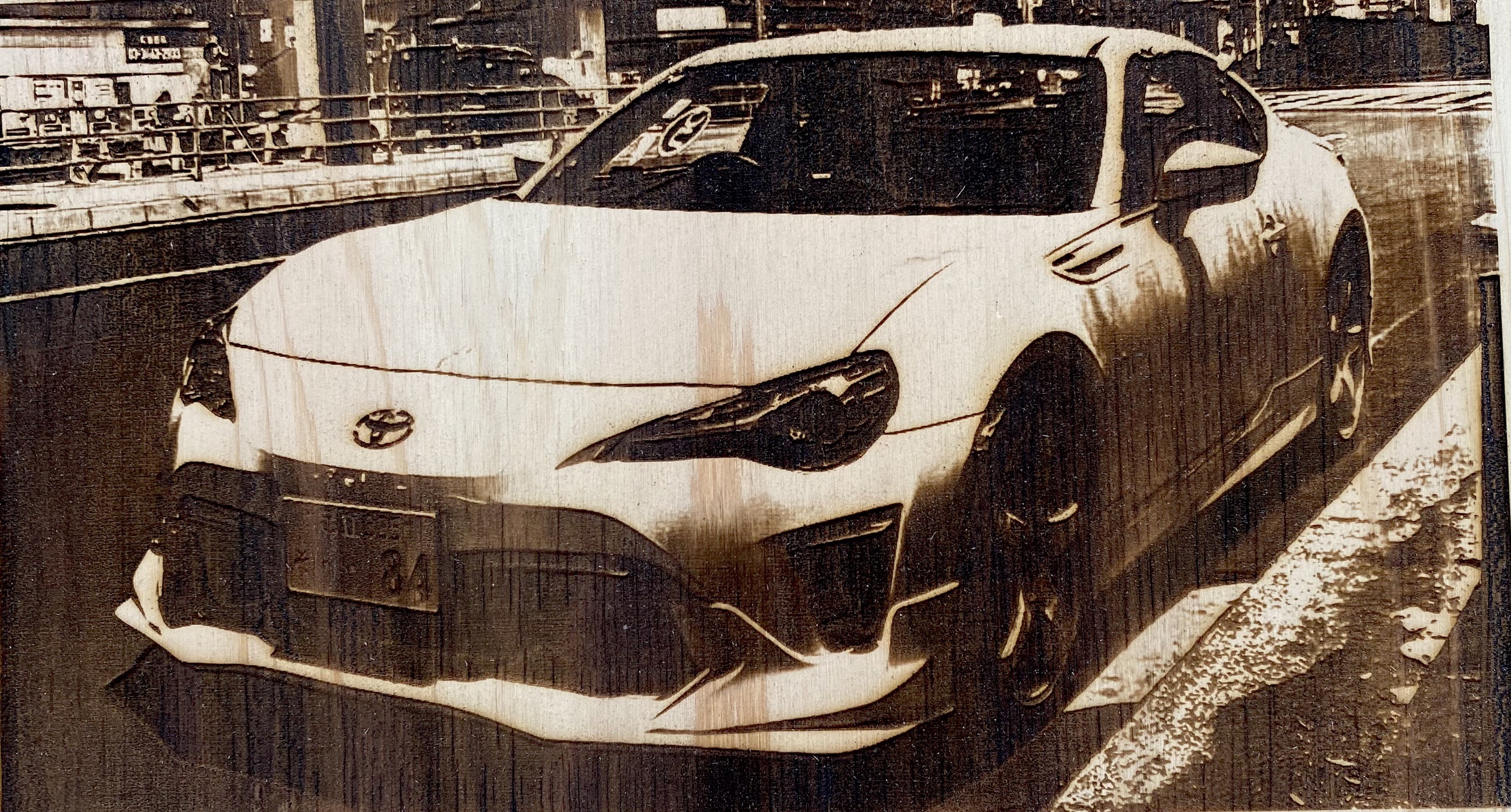 お客様の愛車や愛犬を木を使って1枚の彫刻写真に